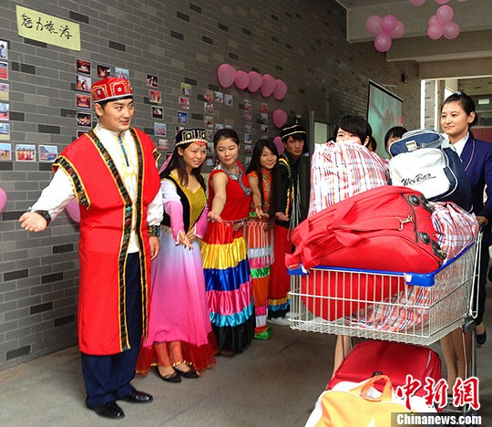 9月8日,无锡城市职业技术学院2013级新生报道当天,该校组织了少数民族学生身着民族服饰迎新生。据悉,今年无锡城市职业技术学院录取的新生分别来自全国19个省、市、自治区。