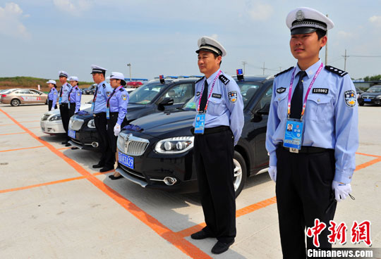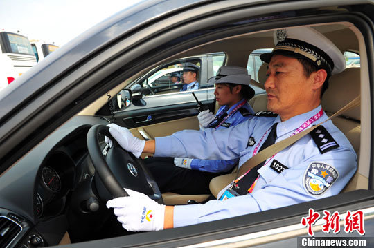 沈阳交警前导团队秉承和谐交通、不扰民、不设专用道的理念,每天准备警车15台左右,保障新闻车队出入40余次,工作时间由早上5时30分持续到每晚0时。中新社发 于海洋 摄