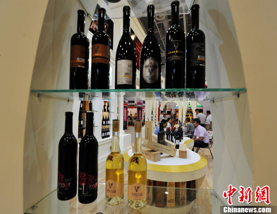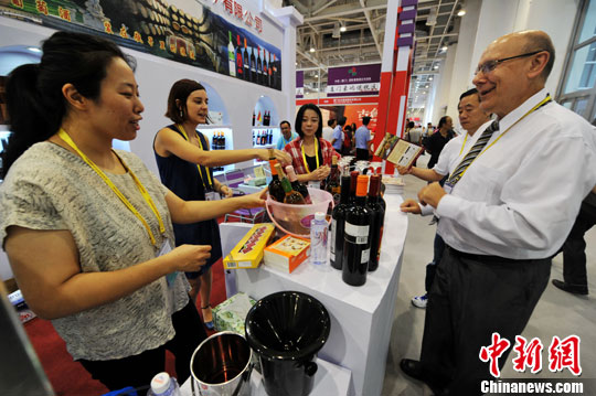 9月9日,外商在展会上推销家乡葡萄酒。第二届中国国际葡萄酒及烈酒展览会在厦门举行,展会共设置进口酒、国产酒专区,展品包括酒器具、酒窖设计和酒类培训课程等酒文化周边产品,展出面积1万平方米,展位250个。中新社发 张斌 摄