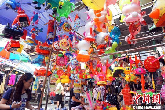 9月9日,临近中秋佳节,香港市面琳琅满目的各式灯笼陆续上市,今年有不少造型奇趣的电子环保花灯,吸引市民选购。中新社发 洪少葵 摄