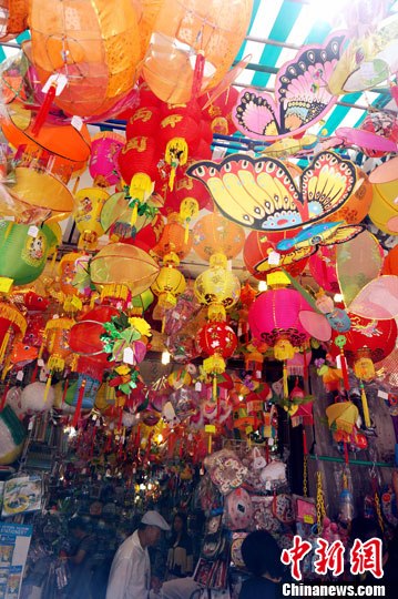 9月9日,临近中秋佳节,香港市面琳琅满目的各式灯笼陆续上市,今年有不少造型奇趣的电子环保花灯,吸引市民选购。中新社发 洪少葵 摄