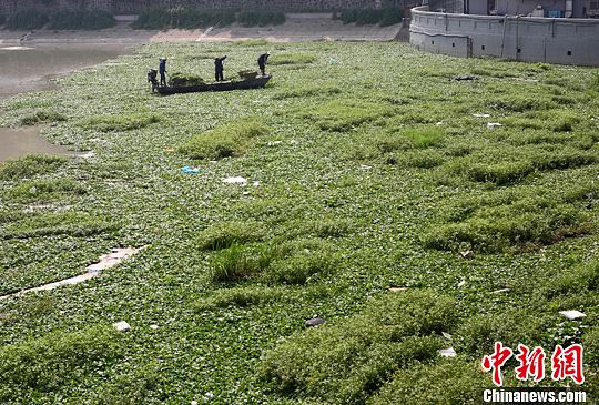 9月9日,工人们在水面上打捞疯长的水葫芦。中新社发 泱波 摄