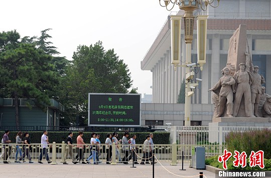 9月9日,北京毛主席纪念堂外排起了长队。2013年9月9日是毛泽东逝世37周年忌日,纪念堂也于当日调整了开放时间,延长半天开放,以便于民众前来瞻仰、纪念。中新社发 史元丰 摄