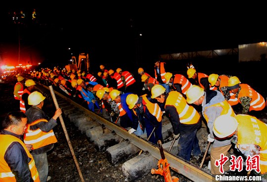 9月11日凌晨,两名工人正在连接铁轨。中新社发 胡友军 摄