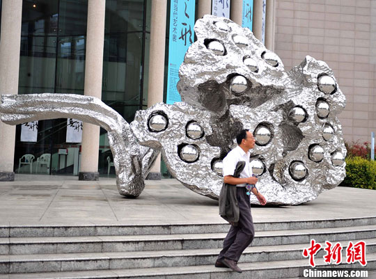 9月11日,两米多高、名为“莲说”的不锈钢“莲蓬”亮相武汉街头。中新社发 张畅 摄