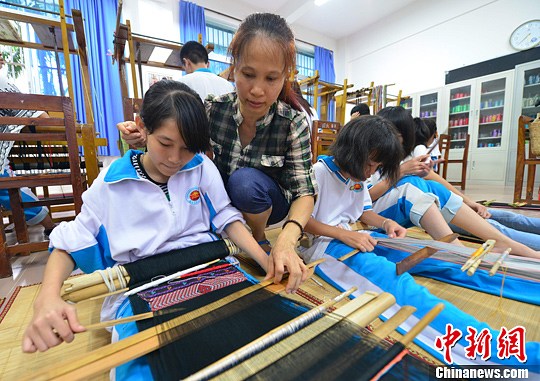 9月11日,在海南国兴中学的少数民族传统技艺学习室黎族教师陈丹正在教授同学们织黎锦。中新社发 骆云飞 摄