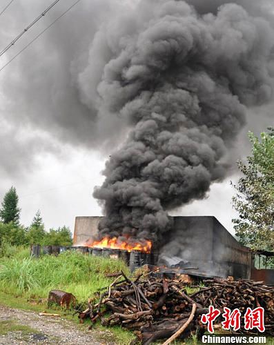 江西省万载县三兴镇红旗村一个沥青炼制加工点11日傍晚发生火灾,4吨沥青在雨中猛烈燃烧。黄正标 摄