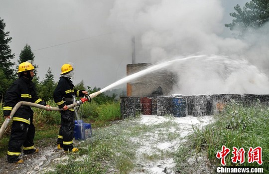 江西省万载县三兴镇红旗村一个沥青炼制加工点11日傍晚发生火灾,4吨沥青在雨中猛烈燃烧。黄正标 摄