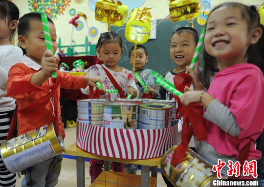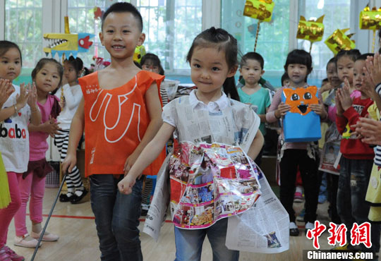 9月12日,安徽合肥西园街道幼儿园小朋友穿上废旧报纸做成的衣服,敲起空奶粉罐做成的鼓,迎接“世界清洁地球日”的到来。中新社发 张娅子 摄