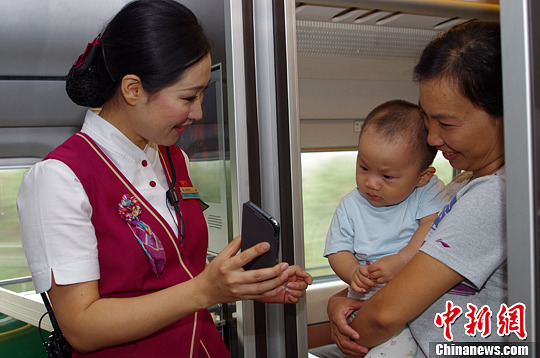 9月12日,由北京开往大连北的D45/4次列车上,列车长周晖正在指导乘客的婴幼儿安全乘车知识。中新社发 贾天勇 摄