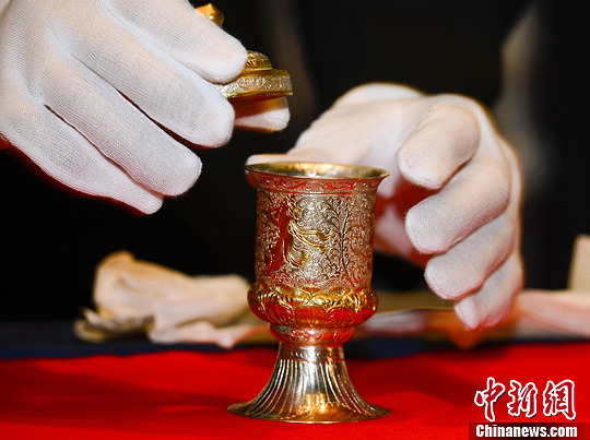 图为在开箱仪式中展出的文物,1987年出土于陕西省宝鸡市法门寺唐代地宫的“鎏金伎乐纹银香宝子”,现藏法门寺博物馆。中新社发 刘震 摄