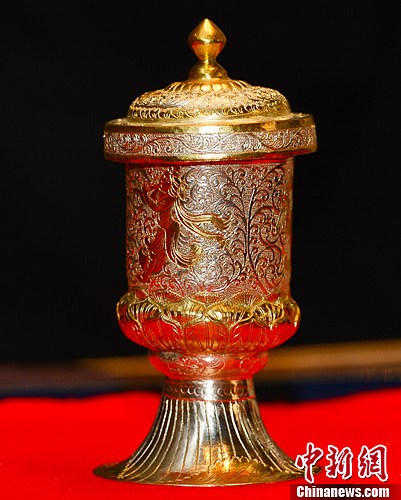 图为在开箱仪式中展出的文物,1987年出土于陕西省宝鸡市法门寺唐代地宫的“鎏金伎乐纹银香宝子”,现藏法门寺博物馆。中新社发 刘震 摄