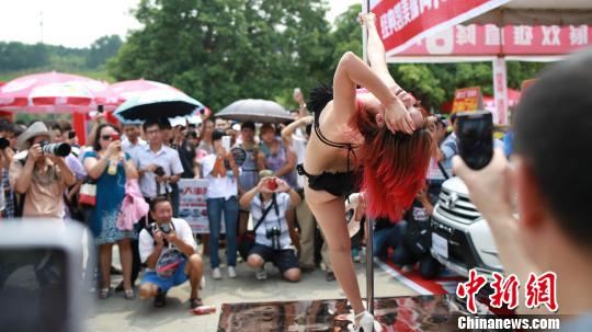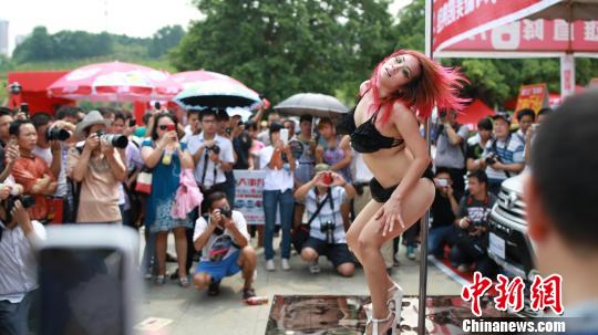 9月13日,在广西南宁开幕的北部湾车展上,某展商请来钢管舞女郎激情热舞。王刚 摄