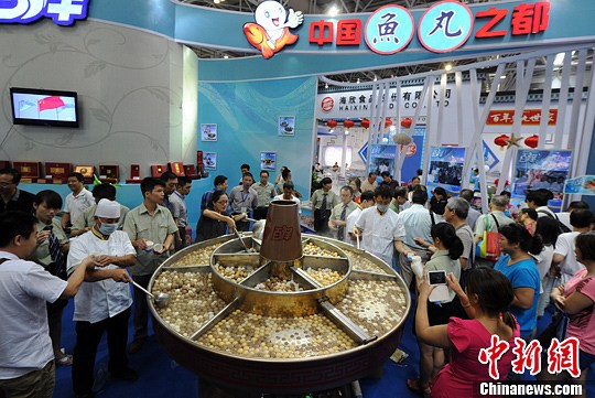 9月13日,近千名民众在2013海峡(福州)渔业周•第八届海峡(福州)渔业博览会中国鱼丸之都展区内争先品尝,由被誉为“中国鱼丸第一锅”烹饪的200公斤鲜美鱼丸。中新社发 刘可耕 摄