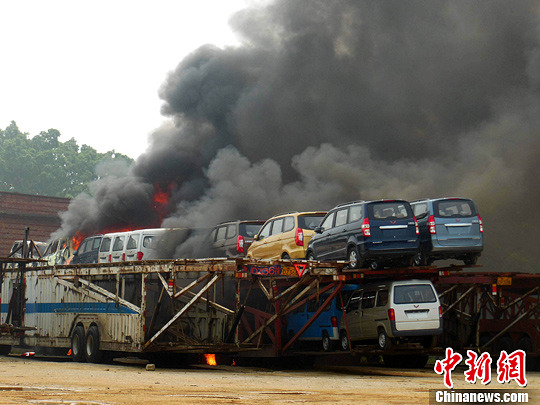 9月13日上午10时40分,广西柳州市柳工大道中段一停车场内,一辆载有20余辆汽车的挂车起火。当地消防官兵闻讯赶往处置,经过1个多小时的努力,车上明火基本被控制,但有13辆小车不同程度受损。中新社发 古豪 摄