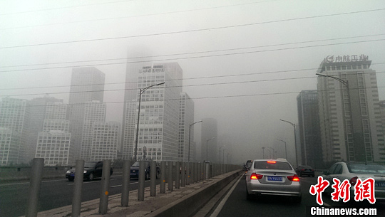9月13日,北京雾气朦胧,能见度较差,傍晚雾气仍未散去,给市民出行带来不便。中新社发 温宸鉴 摄
