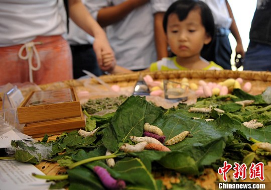 9月13日,安徽农交会上,一儿童与1.5米的冬瓜比个子。当日2013年中国安徽(合肥)农业产业化交易会在安徽国际会展中心开幕。中新社发 韩苏原 摄