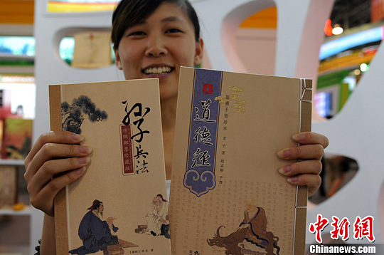 9月13日,安徽农交会上,工作人员展示用丝绸制作的书籍《孙子兵法》、《道德经》。中新社发 韩苏原 摄