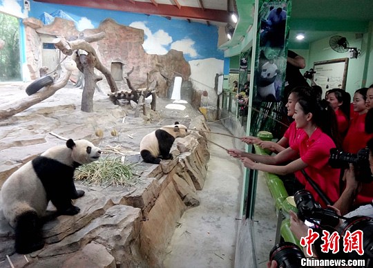 9月13日,由凤凰卫视主办2013中华小姐环球大赛在广州长隆旅游度假区进行外景拍摄。18强佳丽与长隆野生动物世界的熊猫们提前欢度中秋,并亲手制作熊猫爱心月饼送到熊猫双胞胎“博斯”和“绅威”面前喂食。中新社发 刘卫勇 摄