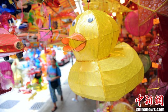 9月13日,位于香港商铺门外挂满各式灯笼,当中最瞩目的是黄鸭。黄色巨鸭早前畅游维港,风靡全城,今个中秋黄鸭化身灯笼主角。中新社发 谭达明 摄