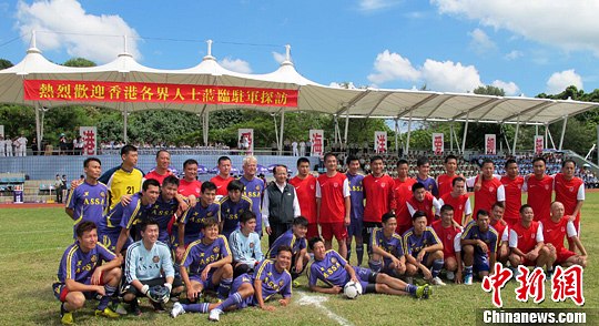 9月14日,香港各界中秋探访团到昂船洲军营慰问解放军驻港部队,驻军足球队与香港演艺界明星足球队踢了一场友谊赛。中新社发 赵建华 摄