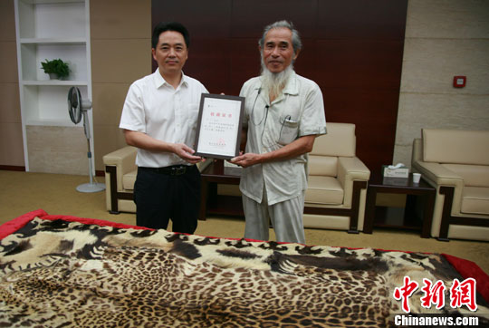 9月24日,自然现存仅3株的濒危珍惜物种百山祖冷杉果实标本和民间珍藏祖传百年的金钱豹皮张工艺制品被无偿捐赠给浙江省自然博物馆收藏和展出。中新社发 李晨韵 摄