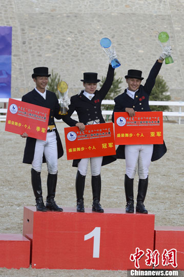 9月24日,第二届中国马术大赛盛装舞步比赛项目结束,新疆队获个人赛、团体赛冠军,最佳马主也落户新疆队。中新社发 刘文华 摄