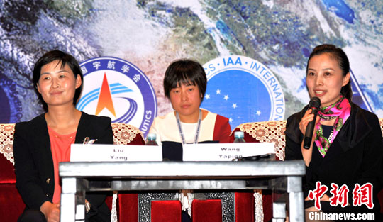 9月24日,正在北京举行的第64届国际宇航大会举办“女性航天50年”专场,中国成功飞天的两位女航天员刘洋、王亚平一道参加,先后发表演讲并与听众互动交流。中新社发 孙自法 摄