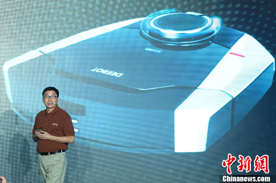 图为科沃斯董事长钱东奇先生介绍地宝9系。中新社发 泱波 摄