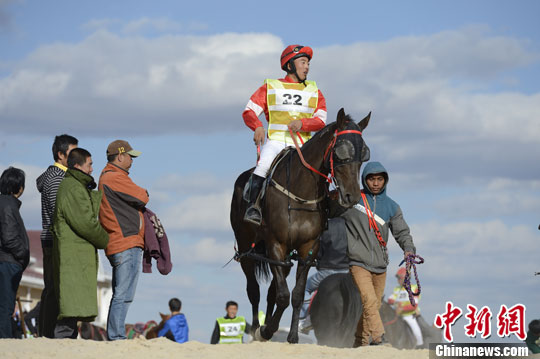 9月25日,在内蒙古锡林浩特举行的第二届中国马术大赛进入第三日的赛程,一名选手骑马步入赛场。中新社发 刘文华 摄