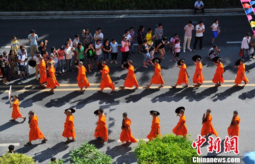 10月2日,僧人方阵从云南瑞丽主干道上列队走过,民众和游客在一旁围观拍照,据了解,这是中国·瑞丽第十三届中缅胞波狂欢节内容之一,1日至3日的活动期间将举行中缅孔雀舞大赛、中缅民族服饰比赛、中缅牛车彩车评选大赛等活动。中新社发 任东 摄