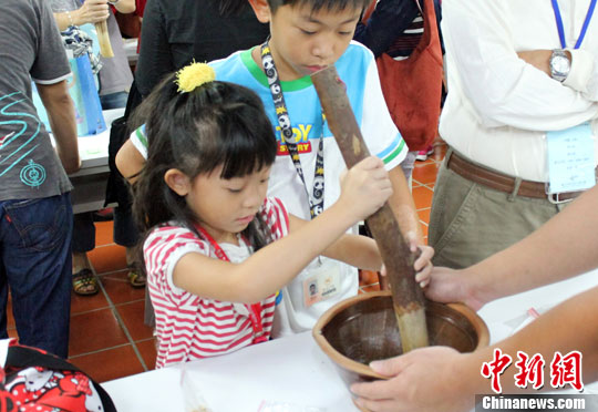 图为小朋友在现场参加擂茶。陈立宇 摄