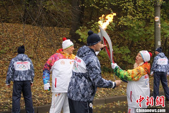 10月7日,2014年索契冬奥会火炬首站在莫斯科传递。图为第100号火炬手萨沙和101号火炬手安娜在观众见证下传递火炬。中新社发 贾靖峰 摄