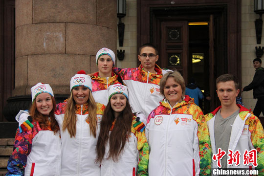 10月7日,2014年索契冬奥会火炬首站在莫斯科传递。图为火炬手们在莫斯科大学门前。中新社发 贾靖峰 摄