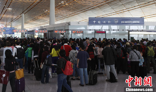 10月7日,十一黄金周出境游的中国公民在北京首都机场入境处排起长龙签入境章。目前中国公民出境目的地国家和地区将近150个,几乎覆盖了全球所有国家和地区,“黄金周”出境游拉动世界各国旅游经济。中新社发 杨可佳 摄