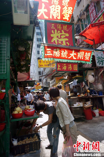 街上沿途有不少街边卖湿货的小商贩,包括卖鲜鱼虾蟹的、粮油杂货,有新鲜的,也有冻肉,保留着过去香港人的生活面貌及纯朴的一面。中新社发 洪少葵 摄