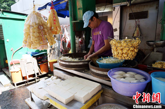 街上沿途有不少街边卖湿货的小商贩,包括卖鲜鱼虾蟹的、粮油杂货,保留着过去香港人的生活面貌及纯朴的一面。中新社发 洪少葵 摄