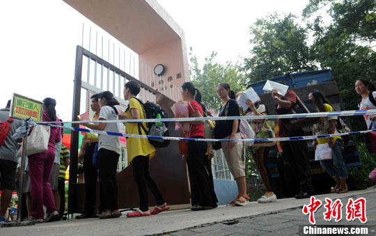 10月8日,香港北区继续有大批家长在幼儿园外大排长龙。当天,上水一间幼儿园早上派发报名表,截至中午时,已派发过千份表。中新社发 谭达明 摄