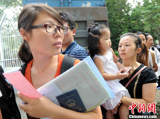 10月8日,有跨境学童家长在上水一幼儿园外排队,索取入学表。中新社发 谭达明 摄