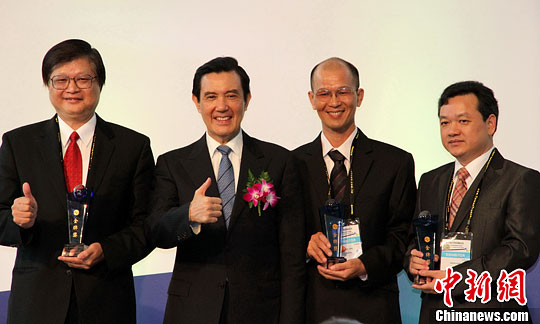 图为台湾地区领导人马英九在台湾电子三展开幕式上颁发科技创新金牌奖。冽玮 摄