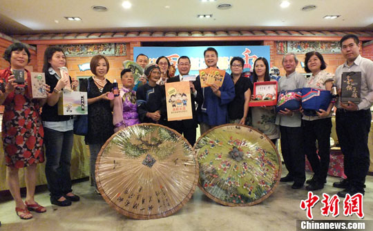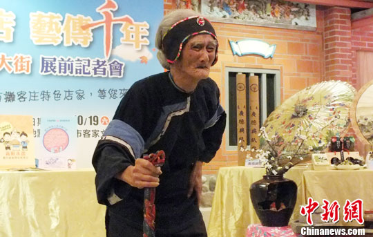 10月8日,台北市客委会8日在台北市客家文化主题园区举办“客庄百年老店 艺传千年”记者会。图为客委会官员与老店业者展示台湾客家庄百年老店特色产品。中新社发 陈立宇 摄