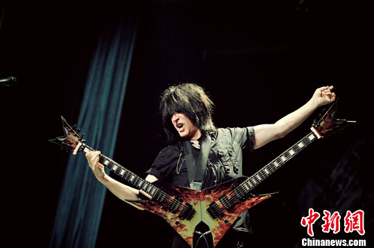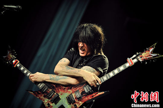 10月8日晚,有着“无影手”之称的世界速度吉他大师,美国人麦可·安吉洛(Michael Angelo)来到天津音乐学院,为摇滚乐迷上演了一场速度与激情的吉他盛宴。中新社发 佟郁 摄