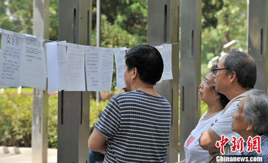 10月9日,在武汉解放公园里园内的“姻缘角”挂上了很多征婚信息,吸引了不少关注者的眼球。其中大多数是父母替儿女征婚。图为解放公园姻缘角父母们认真阅读征婚信息。中新社发 张畅 摄