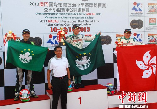 10月13日,由中国-澳门汽车总会主办、澳门特区政府体育发展局及旅游局协办的“2013澳门国际格兰披治小型赛车锦标赛”落下帷幕。澳门车手郑颖聪(右二)、张梓安(左一)获得KZ澳门杯冠亚军。中新社发 毕永光 摄