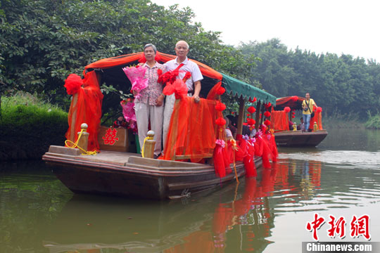 10月13日,广东南海大湿地公园举办首届金婚集体婚礼,为金婚夫妇与银婚夫妇披上洁白的婚纱,穿上豪华的礼服,重温浪漫婚礼,弥补心中遗憾。整个婚礼程序按照岭南水乡婚礼来举办,包括化妆、水上接亲、巡游、放生鱼类、拜堂、婚宴、外景拍摄等。中新社发 曾令华 摄