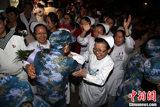 10月13日深夜,完成“和谐使命—2013”的中国海军总医院医护人员回到北京。中新社发 毛宇 摄