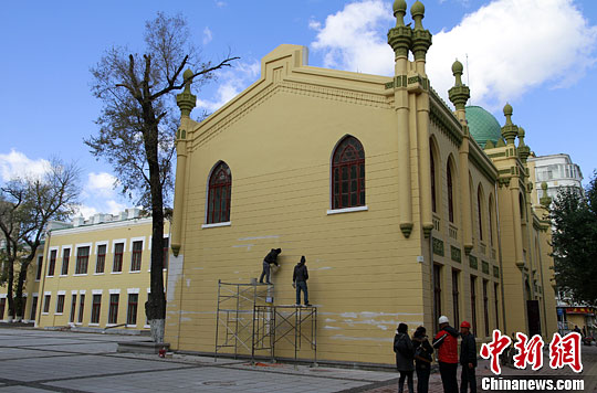 10月14日,位于黑龙江省哈尔滨市通江街82号的犹太老会堂,外墙颜色由之前的白色和灰色按照老照片调整为最初的黄色,穹顶的颜色由红色调整为绿色。中新社发 胡迪 摄