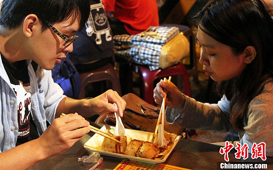 10月14日晚,在台湾台北市的夜市小吃一条街,芋圆、鱼丸汤、鱼酥、水煎包、蚵仔面线、鱿鱼羹、烤虾等小吃品种繁多,吸引众多食客前来品尝。中新社发 钱兴强 摄