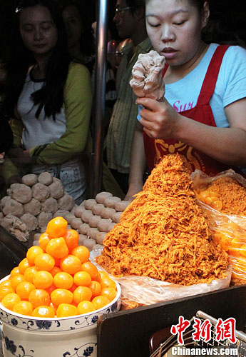 10月14日晚,在台湾台北市的夜市小吃一条街,芋圆、鱼丸汤、鱼酥、水煎包、蚵仔面线、鱿鱼羹、烤虾等小吃品种繁多,吸引众多食客前来品尝。中新社发 钱兴强 摄