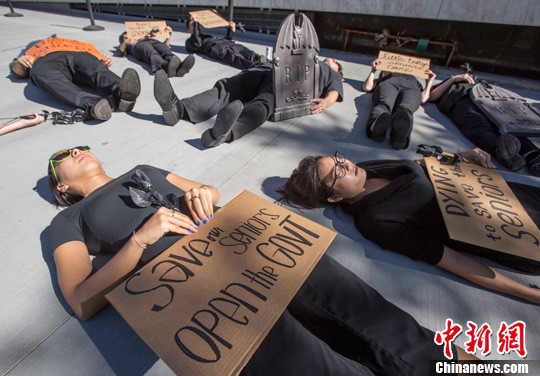 当地时间10月16日,示威者手持黑玫瑰躺在联邦大楼外抗议。当日,一群代表加州退休美国人联盟的成员在美国洛杉矶市中心联邦大楼外抗议示威,反对联邦政府关门及可能影响退休人士的社会保险福利。中新社发 林戈 摄